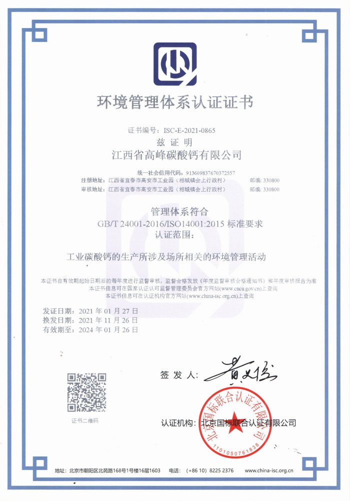 ISO14001環(huán)境管理體系認(rèn)證證書(高峰)