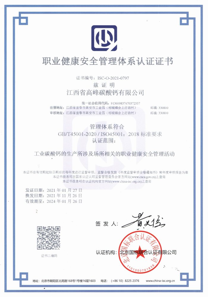 ISO45001職業(yè)健康安全管理認(rèn)證證書(高峰)